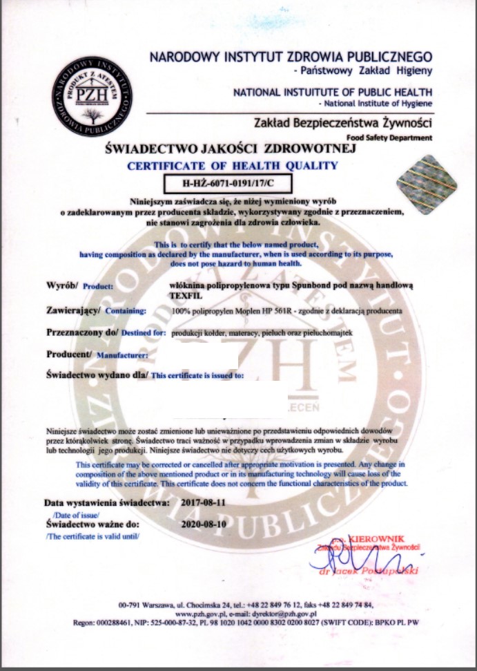 - świadectwo jakości Polskiego Związku Higieny (PZH) ważne do 10.08.2020