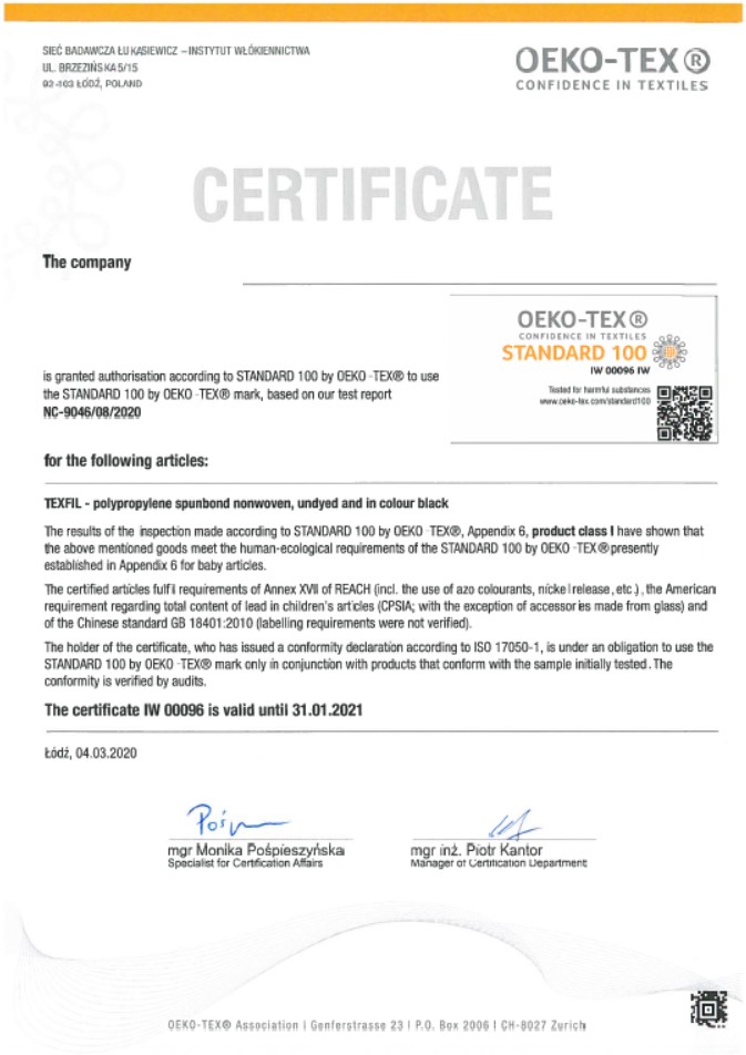 - atest Oeko-Tex® Standard 100 na bezpieczeństwo kontaktu ze skórą dzieci i dorosłych, wydany przez Instytut Włókiennictwa w Łodzi w dniu 4.03.2020